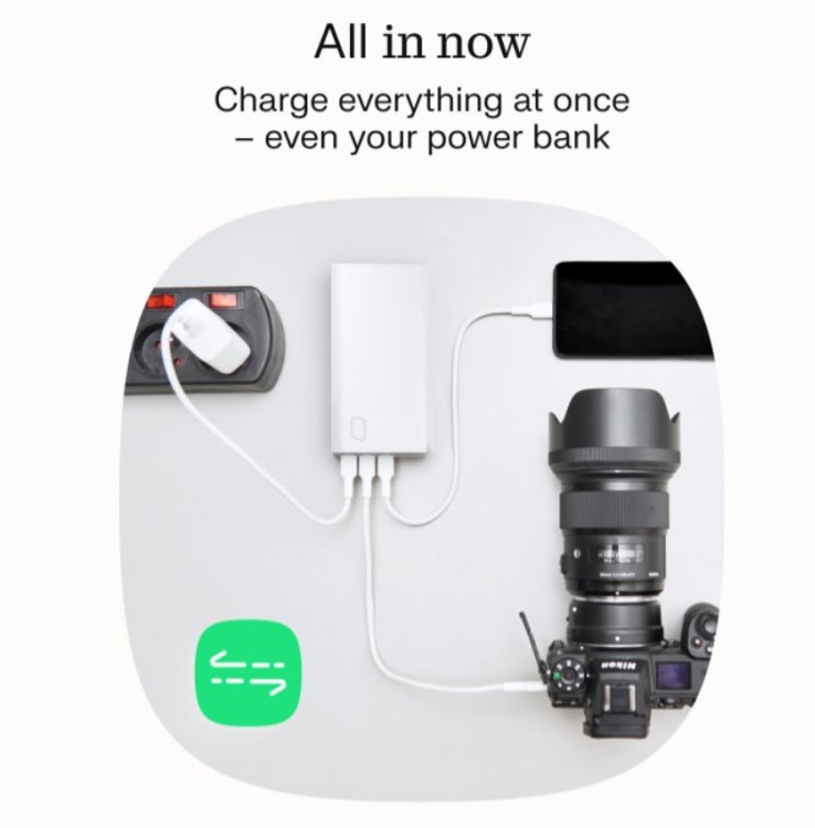 Se čtyřmi porty můžete napájet více zařízení najednou. Dva USB-C vstupy navíc umožňují flexibilní nabíjení samotné powerbanky. Vysoký výkon zaručuje efektivní nabití bez zbytečného čekání.