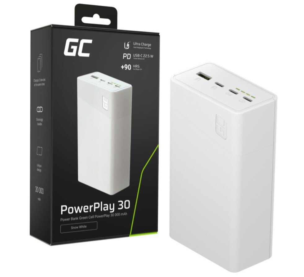 Silná powerbanka s kapacitou 30 000 mAh, čtyřmi výstupy a technologií rychlého nabíjení Quick Charge 3.0 a GC Ultra Charge. Umožňuje nabíjení až tří zařízení zároveň a díky režimu low-power je ideální i pro menší elektroniku jako sluchátka nebo chytré hod