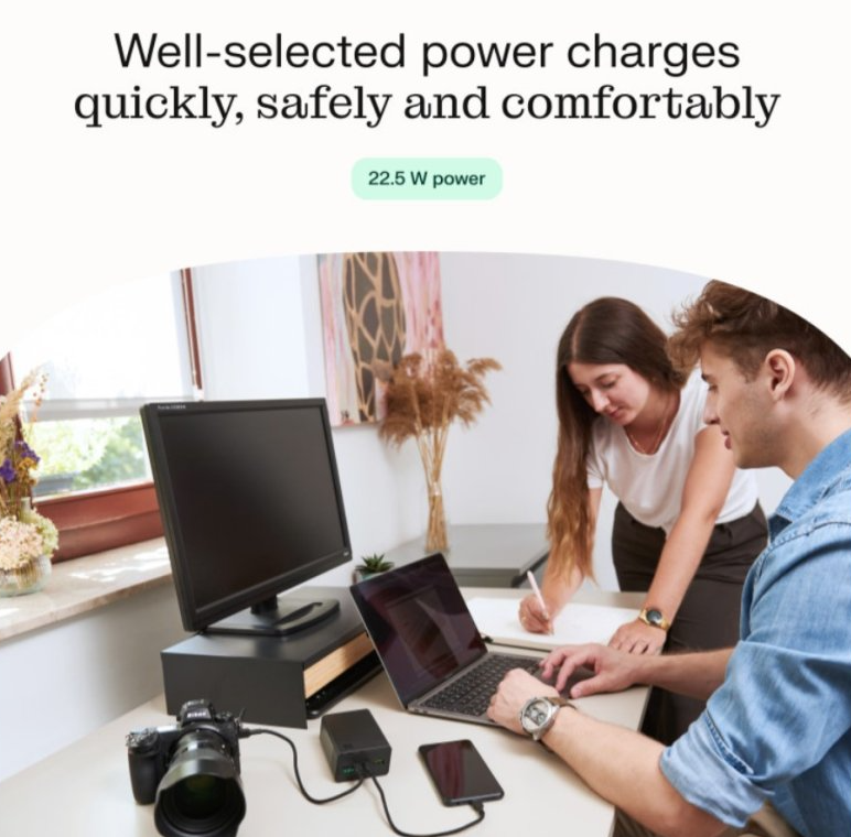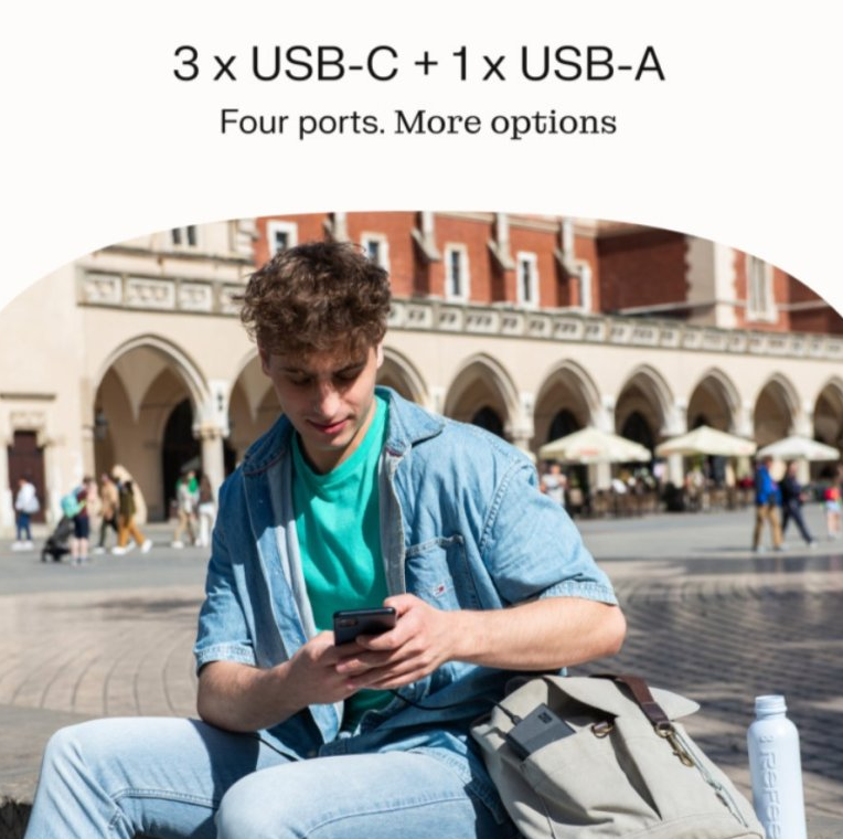 - Výstupy: 3× USB-C (až 22,5 W), 1× USB-A (až 18 W)