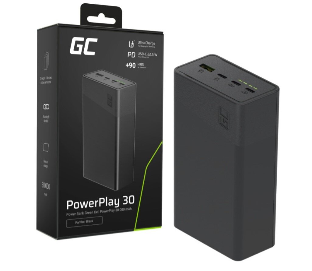 Extra kapacita a rychlost v robustním těle – Greencell PowerPlay 30 (PBGC30B) je výkonná powerbanka s kapacitou 30 000 mAh a podporou rychlého nabíjení až 22,5 W. Umožňuje současné napájení až tří zařízení a podporuje i režim průchozího nabíjení (passthrough), takže můžete nabíjet powerbanku a zároveň i další zařízení.