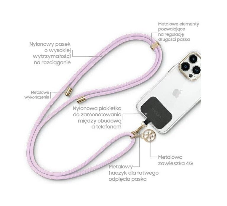 Usnadněte si život s praktickým, ale také stylovým doplňkem pro Váš smartphone! Univerzální šňůrka vyrobená z nylonu je to pravé pro všechny, kteří mají rádi volné ruce ale zároveň chytrý telefon vždy u sebe. Zlatý přívěsek s logem GUESS dodává tomuto doplňku elegantní vzhled. Šňůrku o délce 1.5m lze nastavit dle potřeby, vše co potřebujete je smartphone s ochranným krytem.