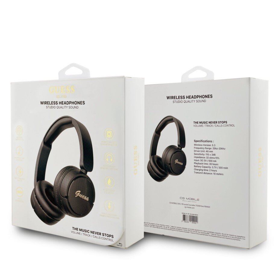 Bezdrátová sluchátka s kovovým nápisem Guess v elegantním script stylu. Ideální volba pro každodenní poslech, telefonování i jako módní doplněk.