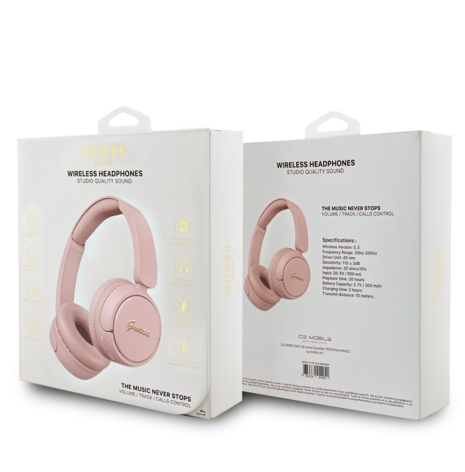 Bezdrátová sluchátka s kovovým nápisem Guess v elegantním script stylu. Ideální volba pro každodenní poslech, telefonování i jako módní doplněk.