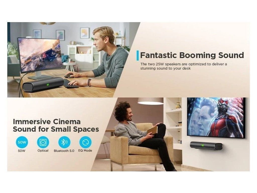 Mini soundbar Bomaker Tapio je vybaven dvěma 25W reproduktory s plným rozsahem, které poskytují vynikající zvuk. Vestavěné pasivní basové chladiče poskytují bohatší a silnější basy. Bluetooth modul ve verzi 5.0 nabízí 4x stabilnější připojení, 2x vyšší přenosovou rychlost a větší kompatibilitu než Bluetooth 4.2. Přizpůsobte si svůj vlastní zvuk jediným kliknutím na dálkové ovládání a využijte vylepšené 3 režimy ekvalizéru.