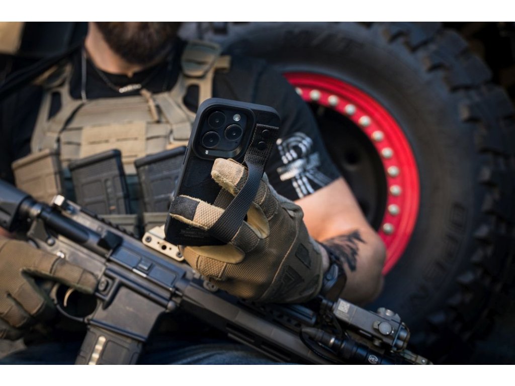 Na zádech Camo design z vysoce odolné látky a ochranné poutko jako pojistka proti pádu. Jádro krytu je